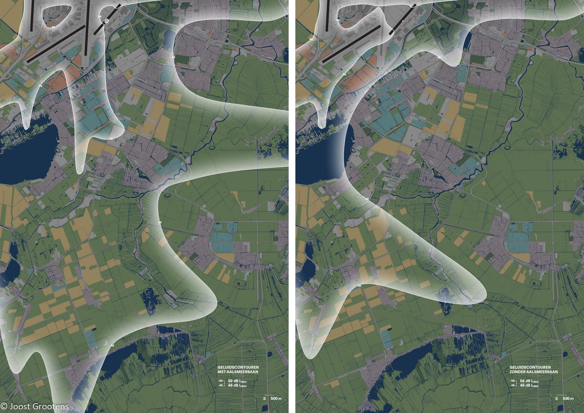 Geluidscontouren mét Aalsmeerbaan (links) en zonder (rechts)